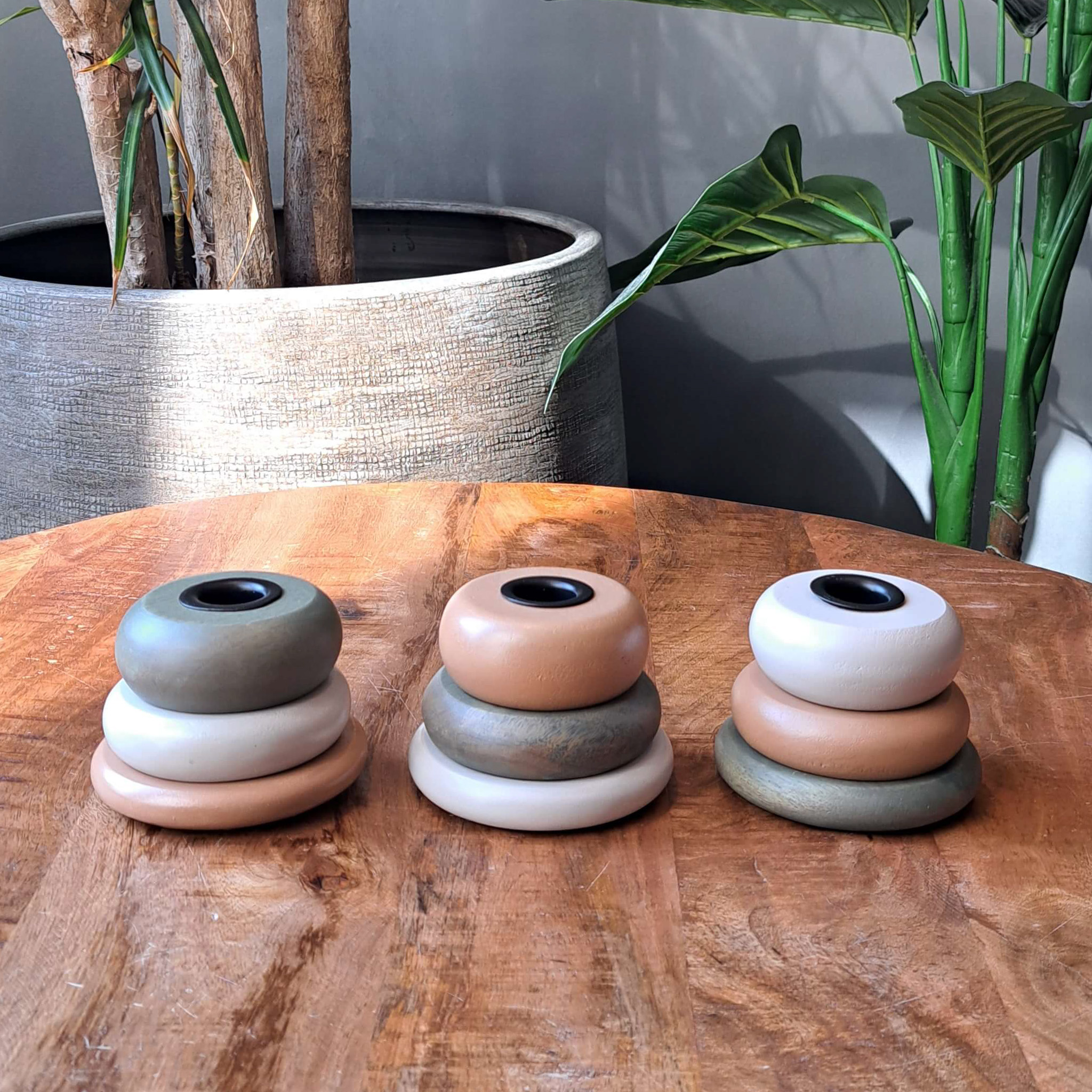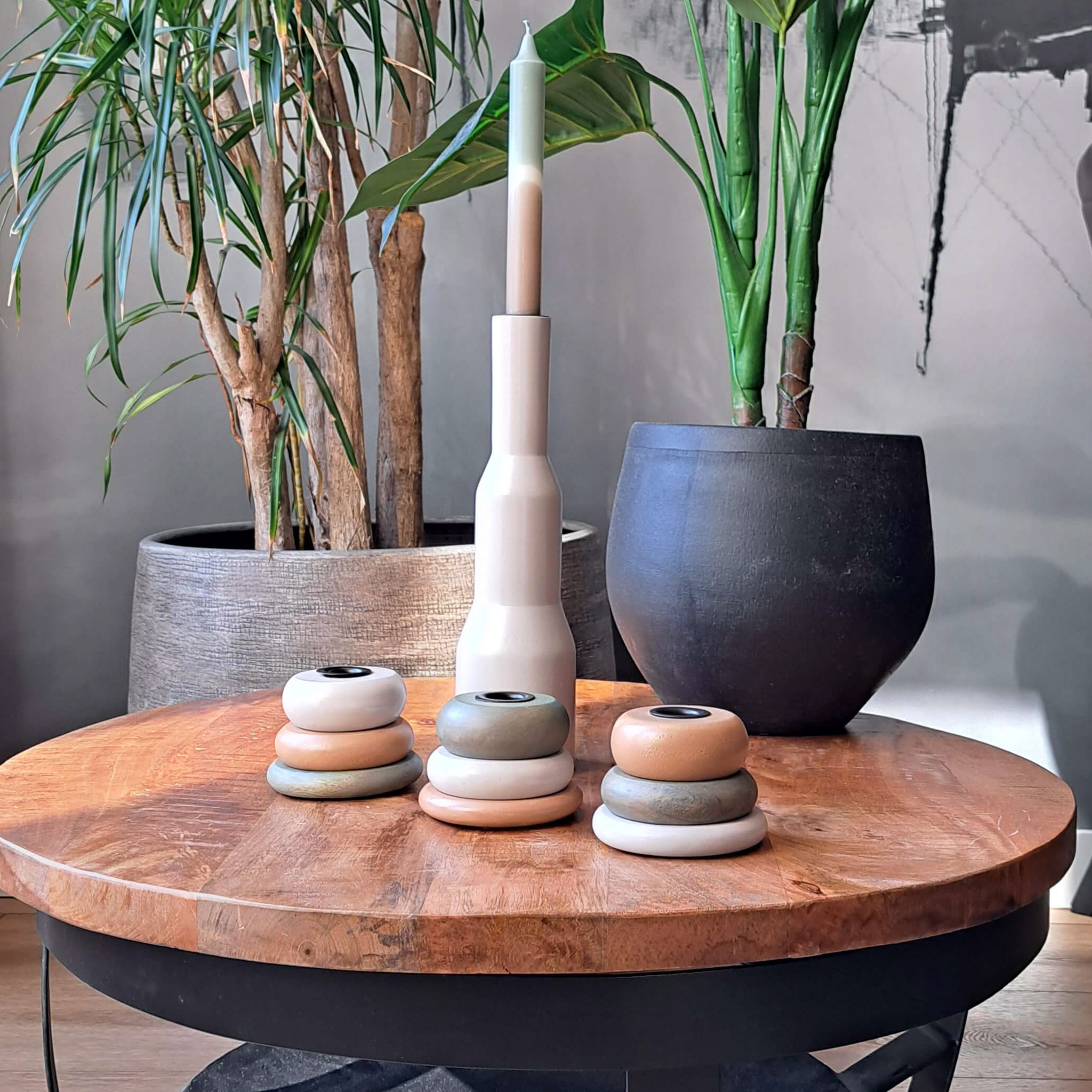 Kies voor een rustige basis of juist een opvallende eyecatcher. De drie losse delen bieden je de vrijheid om per seizoen of stemming te wisselen. Zet ze los op een dienblad, stapel ze tot een totem of mix met andere kandelaars – alles kan.